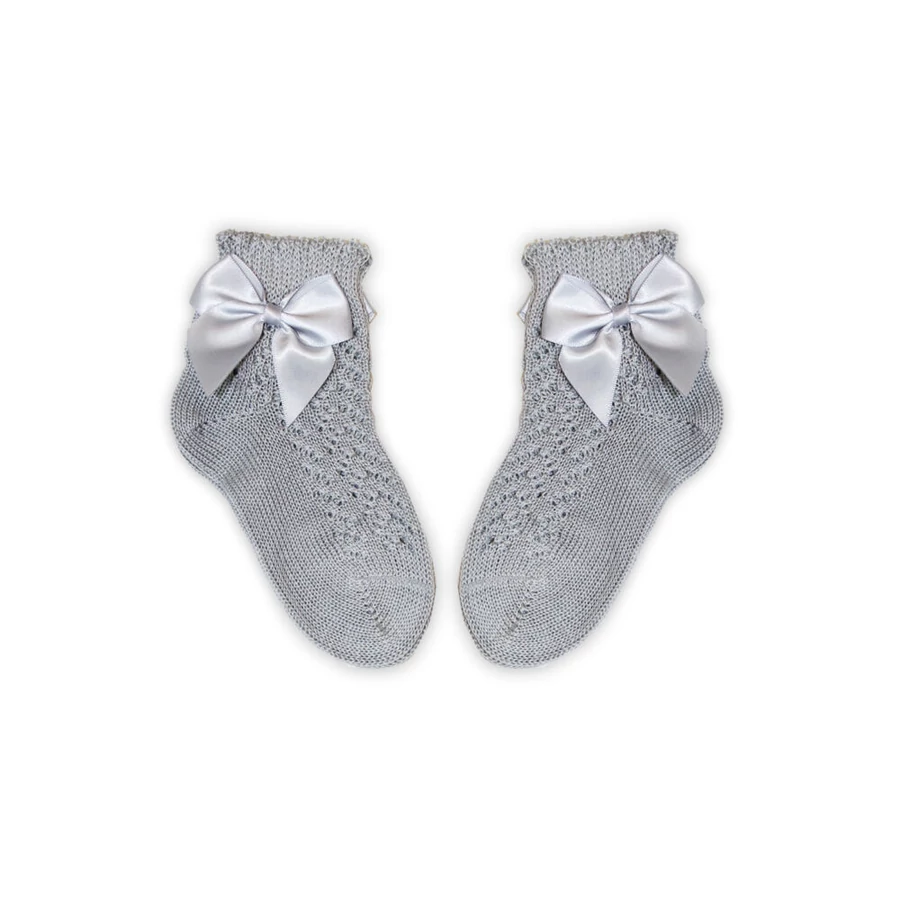 100% pamut kislány baba bokazokni horgolt felsőrésszel - masni díszítéssel - szürke - 16-17