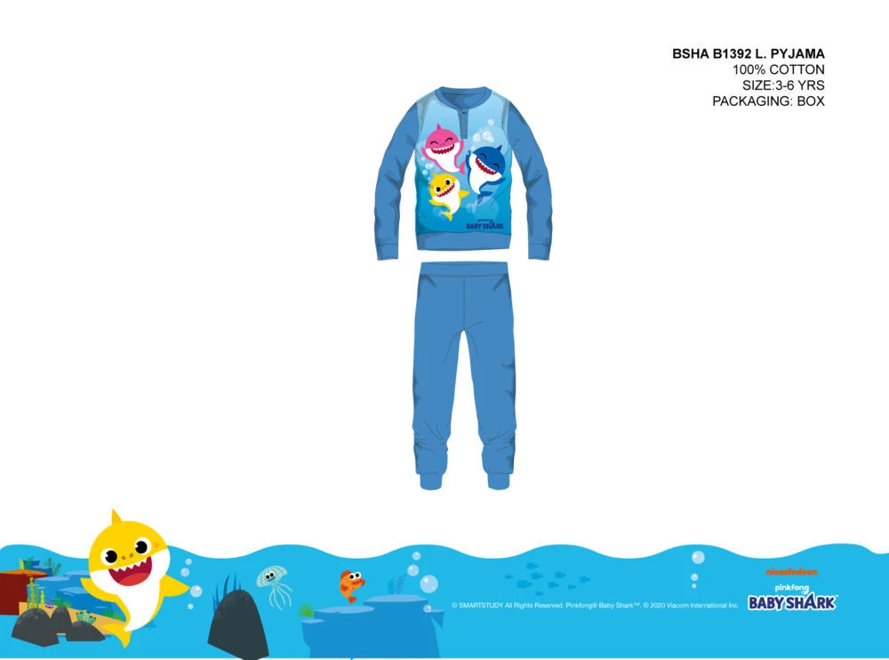 Baby Shark jersey gyerek pizsama 100% pamut alapanyagból. Kényelmes bőrbarát viselet. A termék díszdobozban kapható.