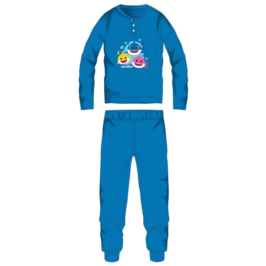 Baby Shark téli interlock pizsama gyerekeknek 100% pamut alapanyagból. Kényelmes bőrbarát viselet. Gombos nyakkialakítással, gumírozott derékrésszel, egyenes, szűkített szárral, Baby Shark mintával. Díszdobozban szállítjuk.
