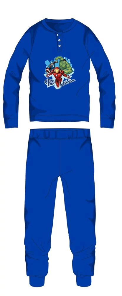 Bosszúállók téli interlock pizsama gyerekeknek 100% pamut alapanyagból. Kényelmes bőrbarát viselet. Gombos nyakkialakítással, gumírozott derékrésszel, egyenes, szűkített szárral, Bosszúállók mintával. Díszdobozban szállítjuk.