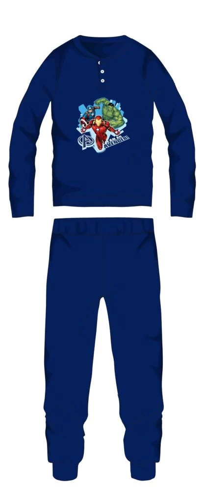 Bosszúállók téli interlock pizsama gyerekeknek 100% pamut alapanyagból. Kényelmes bőrbarát viselet. Gombos nyakkialakítással, gumírozott derékrésszel, egyenes, szűkített szárral, Bosszúállók mintával. Díszdobozban szállítjuk.