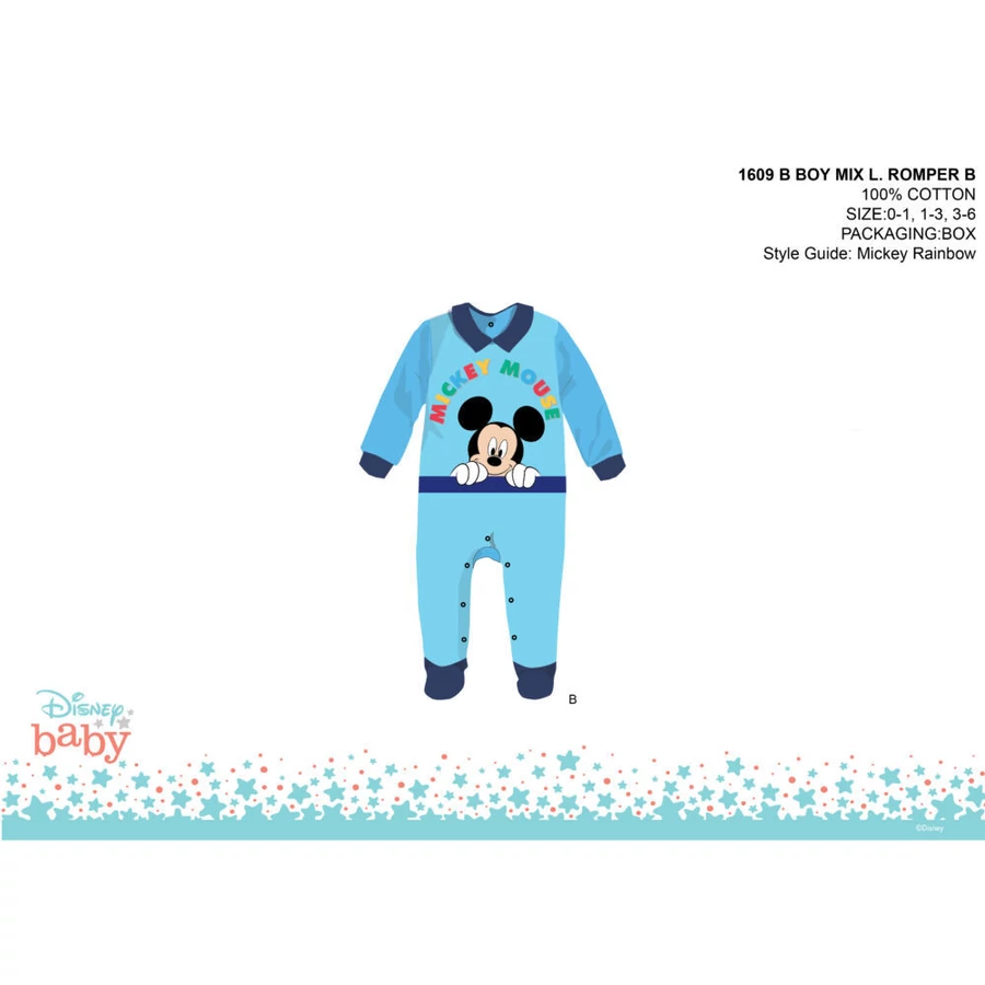 Disney Mickey egér baba rugdalózó 100% pamut alapanyagból. Puha minőségi anyagának köszönhetően a baba kényelmesen fogja érezni magát benne. Hátánál és ülepénél patentos, ami megkönnyíti a baba öltöztetését.