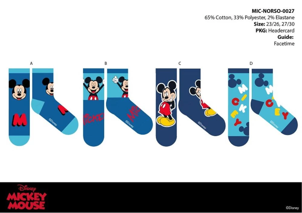Kisfiú normál zokni 4 pár/csomag kiszerelésben, Mickey egér motívummal, különböző színekben.