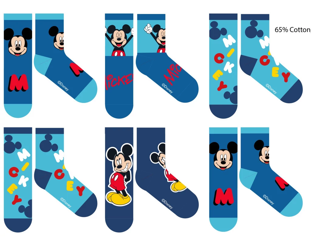 Kisfiú normál zokni 6 pár/csomag kiszerelésben, Mickey egér motívummal, 4 különböző színben.