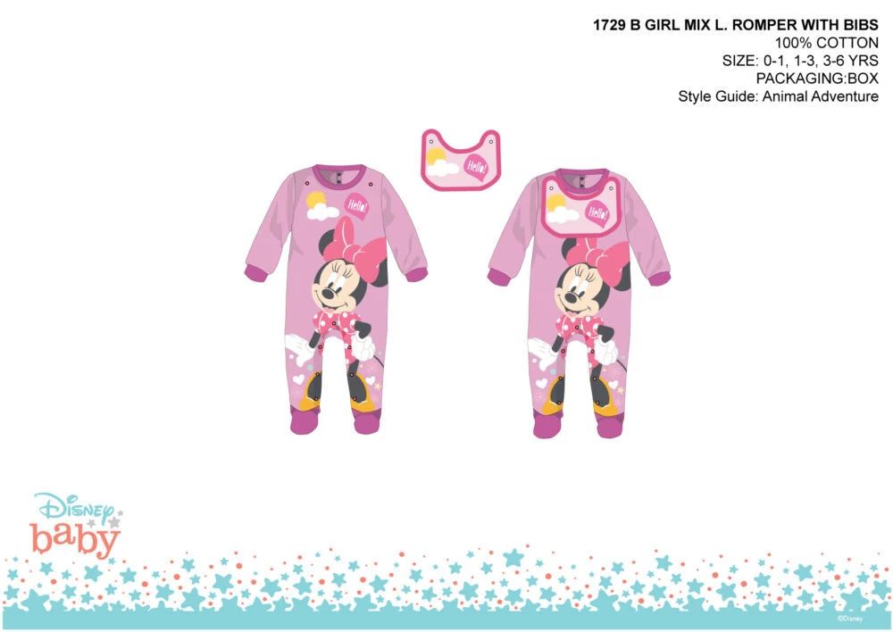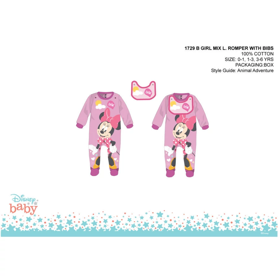 Disney Minnie egér baba rugdalózó 100% pamut alapanyagból. Puha minőségi anyagának köszönhetően a baba kényelmesen fogja érezni magát benne. Hátánál és ülepénél patentos, ami megkönnyíti a baba öltöztetését. Levehető előke 2 patenttal rögzítve.