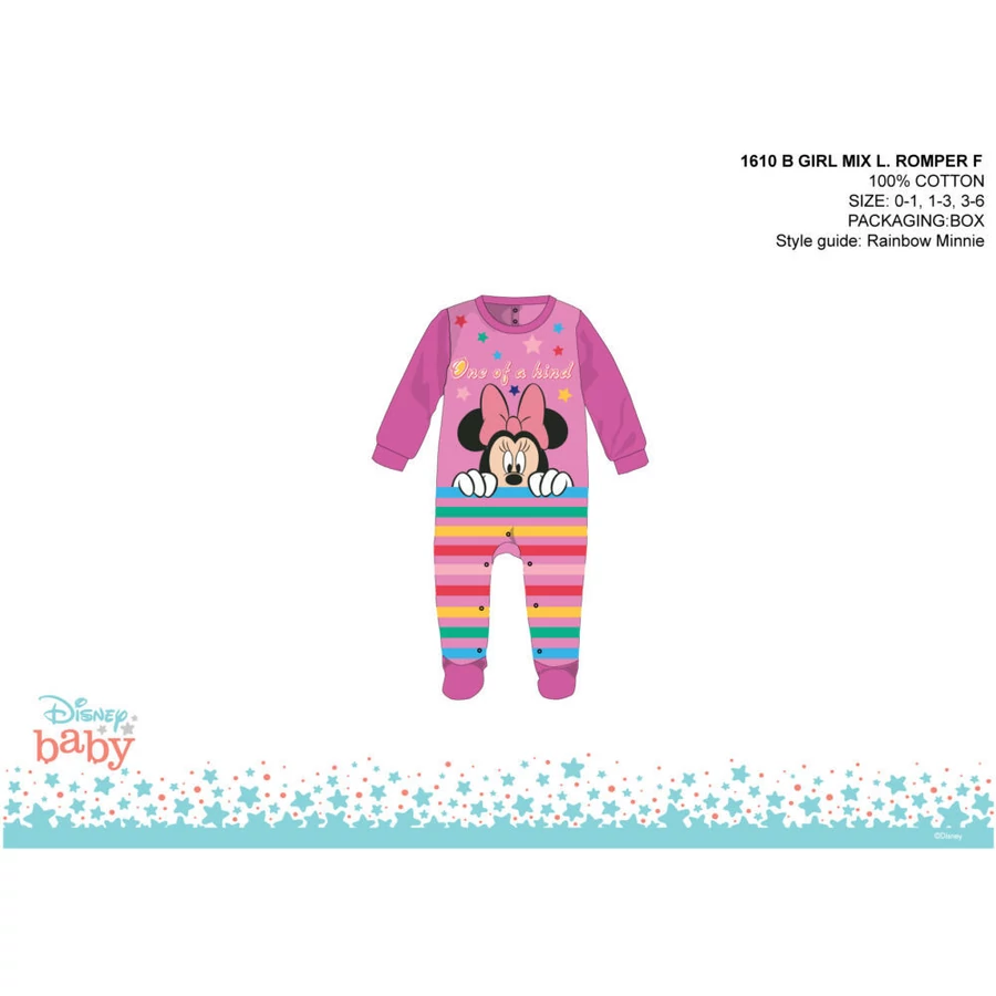 Disney Minnie egér baba rugdalózó 100% pamut alapanyagból. Puha minőségi anyagának köszönhetően a baba kényelmesen fogja érezni magát benne. Hátánál és ülepénél patentos, ami megkönnyíti a baba öltöztetését.