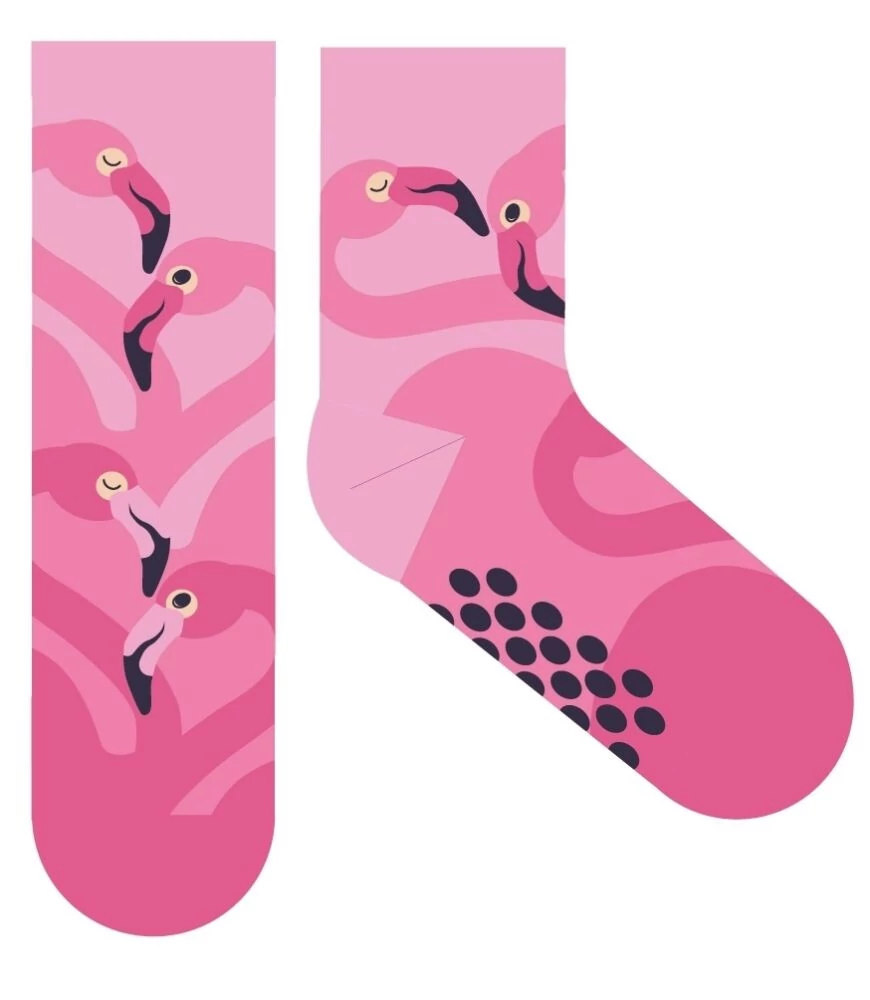 Teliplüss normál zokni kislányoknak csúszásgátló talppal, Flamingó mintával. A talpon lévő szilikonpöttyök biztonságos, csúszásmentes mozgást biztosítanak.
