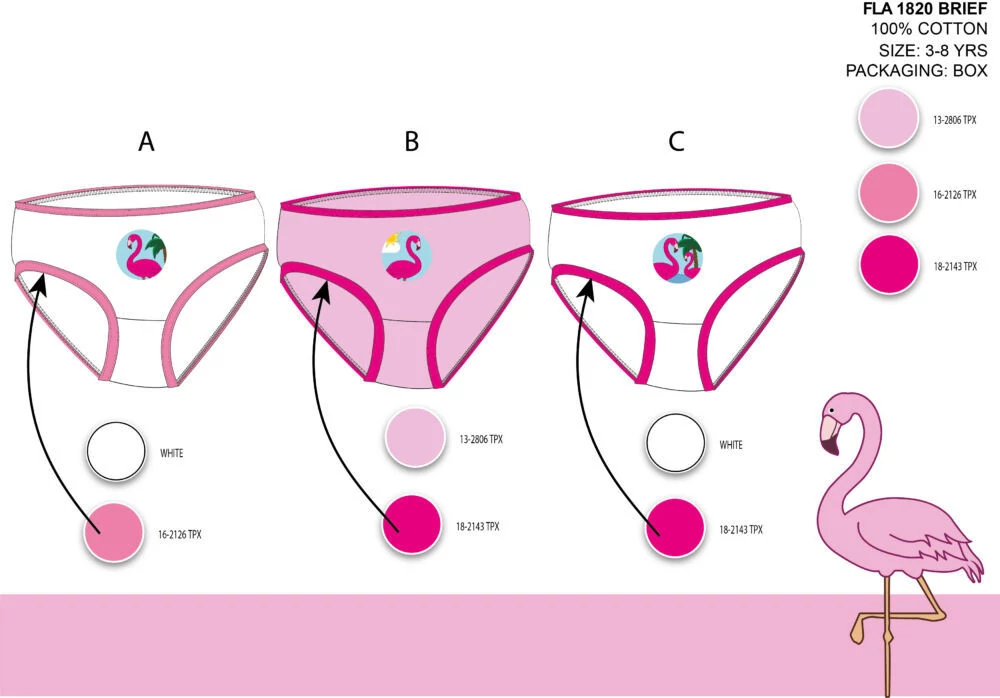 Flamingó lányka alsó szett 3 db/csomag kiszerelésben, 100% pamut alapanyagból. Kényelmes, bőrbarát viselet!