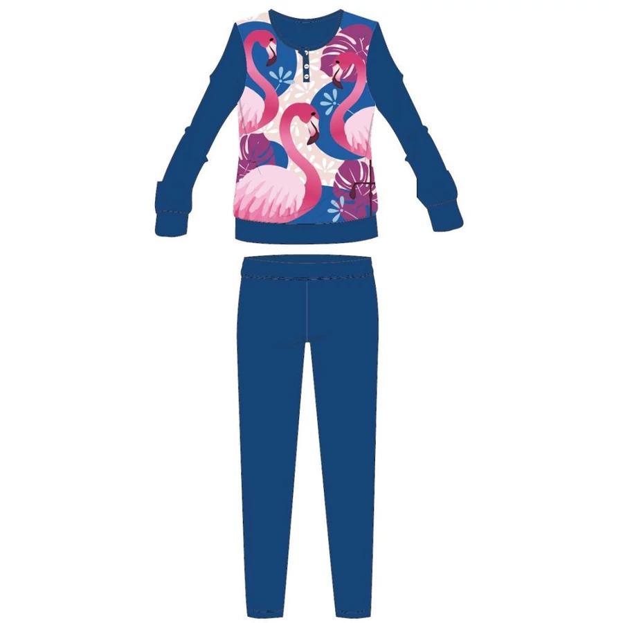 Flamingó téli interlock pizsama gyerekeknek 100% pamut alapanyagból. Kényelmes bőrbarát viselet. Gombos nyakkialakítással, gumírozott derékrésszel, egyenes, szűkített szárral, Flamingó mintával. Díszdobozban szállítjuk.