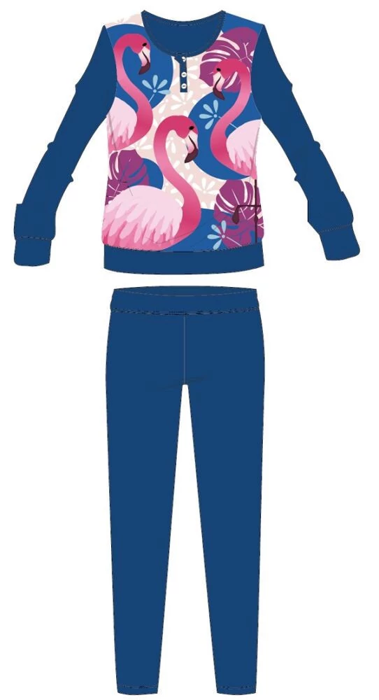 Flamingó téli interlock pizsama gyerekeknek 100% pamut alapanyagból. Kényelmes bőrbarát viselet. Gombos nyakkialakítással, gumírozott derékrésszel, egyenes, szűkített szárral, Flamingó mintával. Díszdobozban szállítjuk.