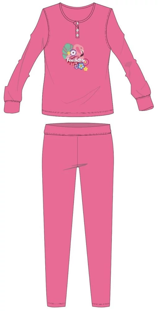 Flamingó téli interlock pizsama gyerekeknek 100% pamut alapanyagból. Kényelmes bőrbarát viselet. Gombos nyakkialakítással, gumírozott derékrésszel, egyenes, szűkített szárral, Flamingó mintával. Díszdobozban szállítjuk.