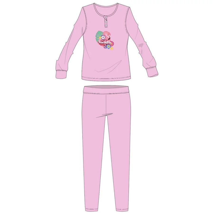 Flamingó téli interlock pizsama gyerekeknek 100% pamut alapanyagból. Kényelmes bőrbarát viselet. Gombos nyakkialakítással, gumírozott derékrésszel, egyenes, szűkített szárral, Flamingó mintával. Díszdobozban szállítjuk.