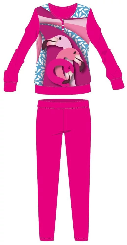 Flamingó téli interlock pizsama gyerekeknek 100% pamut alapanyagból. Kényelmes bőrbarát viselet. Gombos nyakkialakítással, gumírozott derékrésszel, egyenes, szűkített szárral, Flamingó mintával. Díszdobozban szállítjuk.