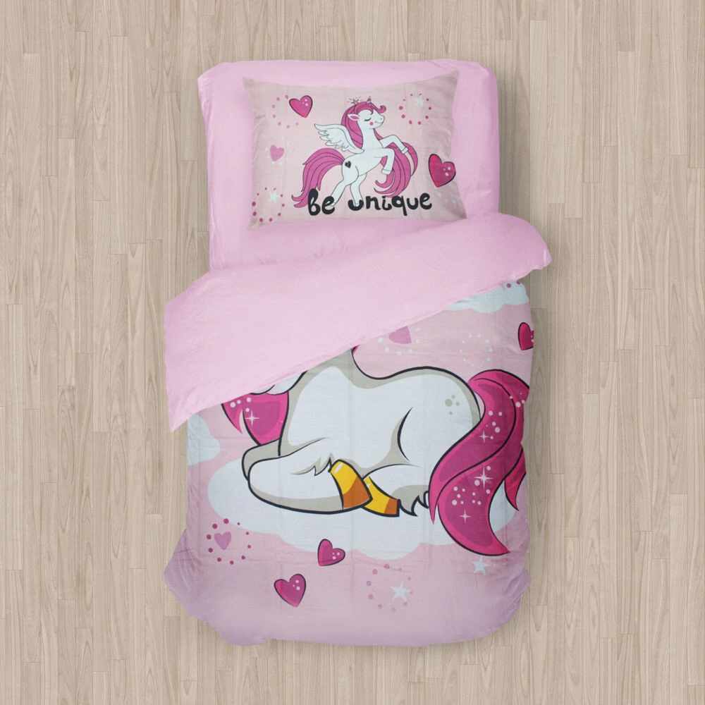 Kislány ágynemű garnitúra Unikornis mintával, 100% pamut anyagösszetétellel. A csomag tartalma: ágytakaró 150 x 265 cm, lepedő 90 x 200 cm, párnahuzat 50 x 80 cm.