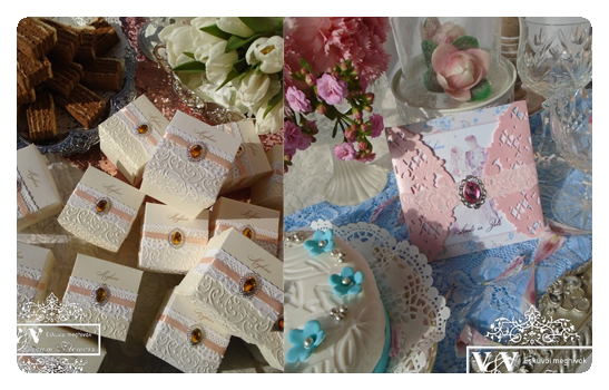 Kedvenc díszítő elemeink a textil és papír virágok, a meseszép csipkék, gyöngyök, strasszok, brossok, kristályok, melyek igazi luxus külsőt kölcsönöznek a papíroknak.