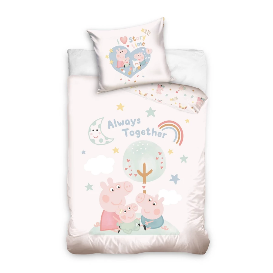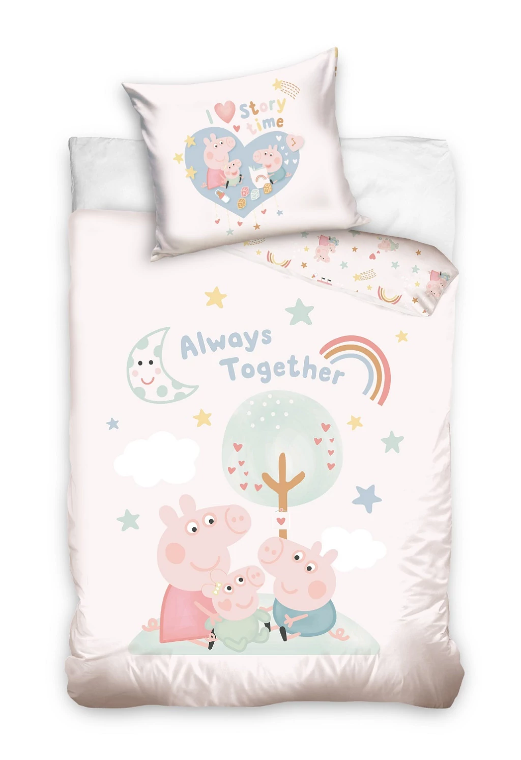 A Peppa Malac 100% pamut gyermek ágyneműgarnitúra 100x135cm ágyneműhuzat + 40x60cm párnahuzat 100% pamut anyagból készült, 100x135 cm-es paplanhuzattal és 40x60 cm-es párnahuzattal a gyerekszoba kedvenc darabja lehet, puha tapintással és látványos mintával.