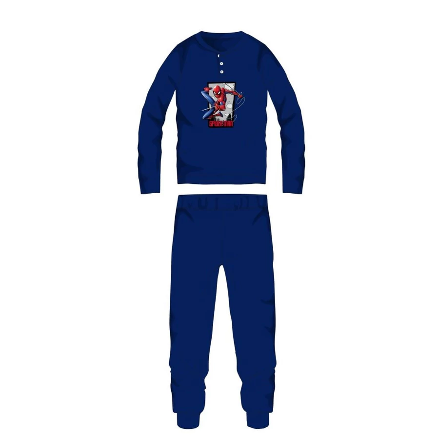 Pókember téli interlock pizsama gyerekeknek 100% pamut alapanyagból. Kényelmes bőrbarát viselet. Gombos nyakkialakítással, gumírozott derékrésszel, egyenes, szűkített szárral, Pókember mintával. Díszdobozban szállítjuk.