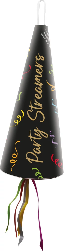 A szalagokat meghúzva konfettiket lövell ki.