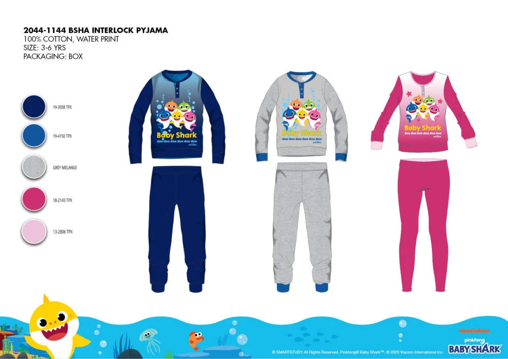 Baby Shark téli interlock pizsama gyerekeknek 100% pamut alapanyagból. Kényelmes bőrbarát viselet. Gombos nyakkialakítással, gumírozott derékrésszel, egyenes, szűkített szárral, Verdák mintával. Díszdobozban szállítjuk.