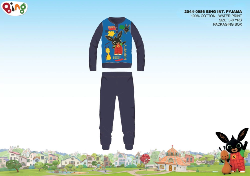 Bing nyuszi téli interlock pizsama kisfiúknak 100% pamut alapanyagból. Kényelmes bőrbarát viselet. Gombos nyakkialakítással, gumírozott derékrésszel, egyenes, szűkített szárral, Bing nyuszi mintával. Díszdobozban szállítjuk.