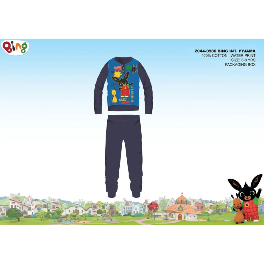Bing nyuszi téli interlock pizsama kisfiúknak 100% pamut alapanyagból. Kényelmes bőrbarát viselet. Gombos nyakkialakítással, gumírozott derékrésszel, egyenes, szűkített szárral, Bing nyuszi mintával. Díszdobozban szállítjuk.