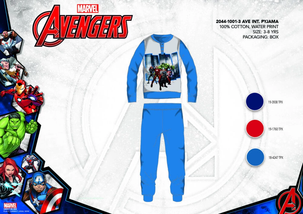 Bosszúállók téli interlock pizsama kisfiúknak 100% pamut alapanyagból. Kényelmes bőrbarát viselet. Gombos nyakkialakítással, gumírozott derékrésszel, egyenes, szűkített szárral, Bosszúállók mintával. Díszdobozban szállítjuk.