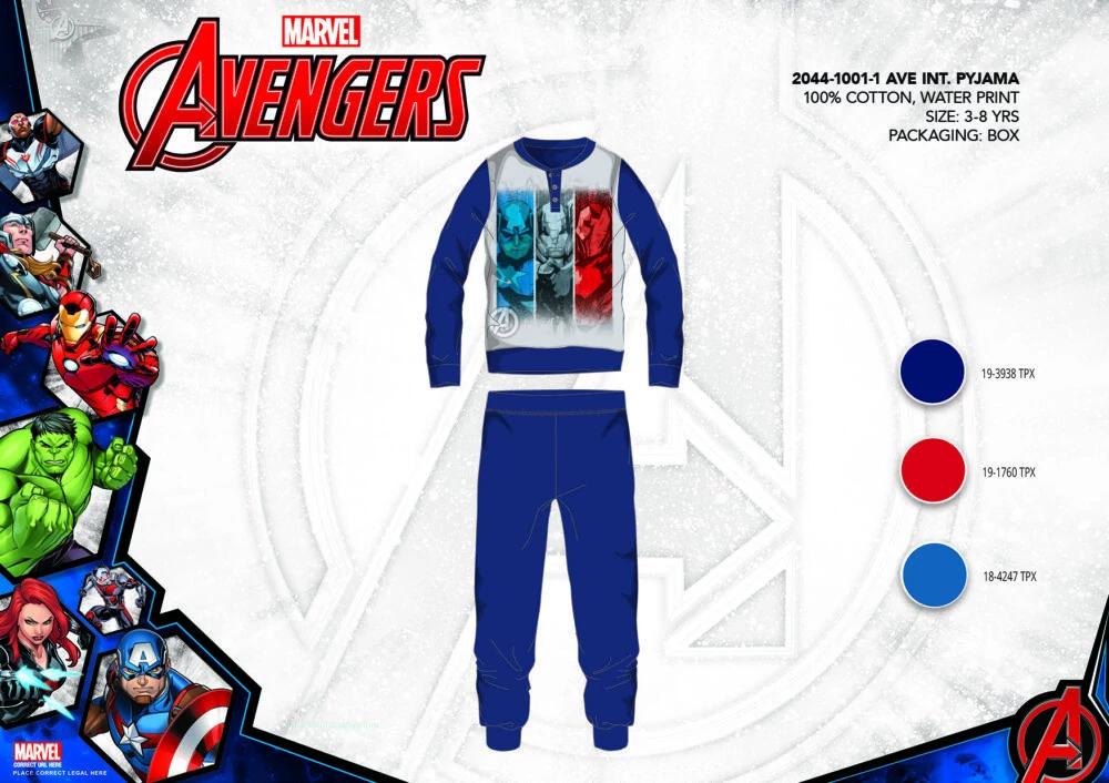 Bosszúállók téli interlock pizsama kislányoknak 100% pamut alapanyagból. Kényelmes bőrbarát viselet. Gombos nyakkialakítással, gumírozott derékrésszel, egyenes, szűkített szárral, Bosszúállók mintával. Díszdobozban szállítjuk.