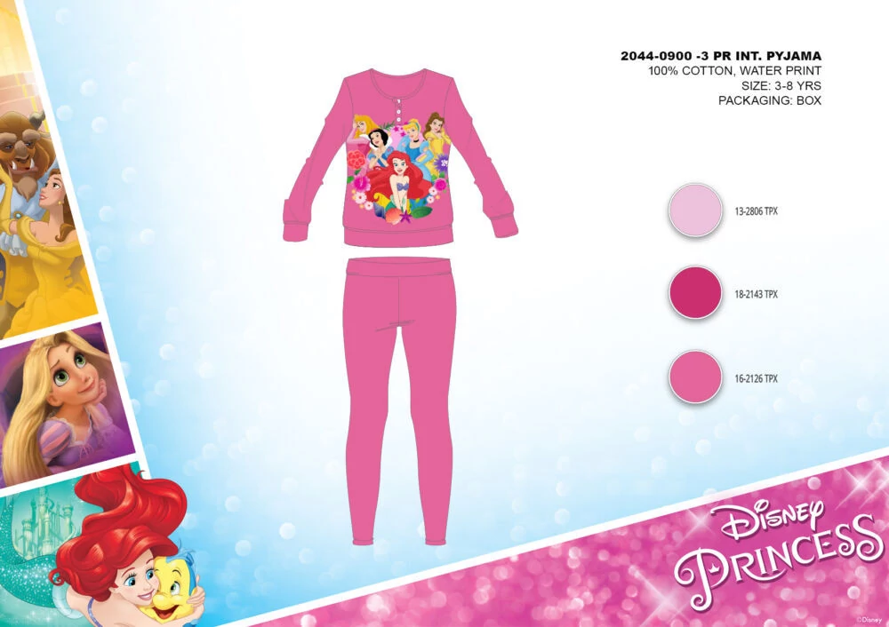 Disney Hercegnők téli interlock pizsama kislányoknak 100% pamut alapanyagból. Kényelmes bőrbarát viselet. Gombos nyakkialakítással, gumírozott derékrésszel, egyenes, szűkített szárral, Hercegnők mintával. Díszdobozban szállítjuk.