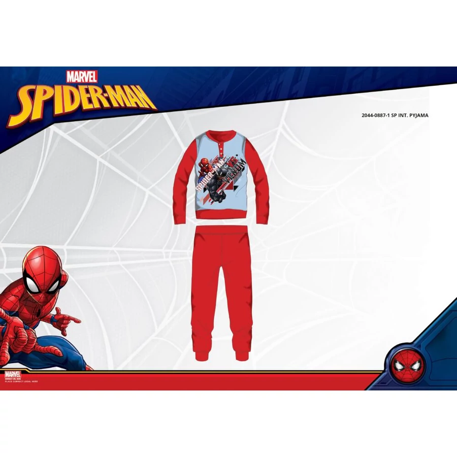 Pókember téli interlock pizsama kisfiúknak 100% pamut alapanyagból. Kényelmes bőrbarát viselet. Gombos nyakkialakítással, gumírozott derékrésszel, egyenes, szűkített szárral, Pókember mintával. Díszdobozban szállítjuk.