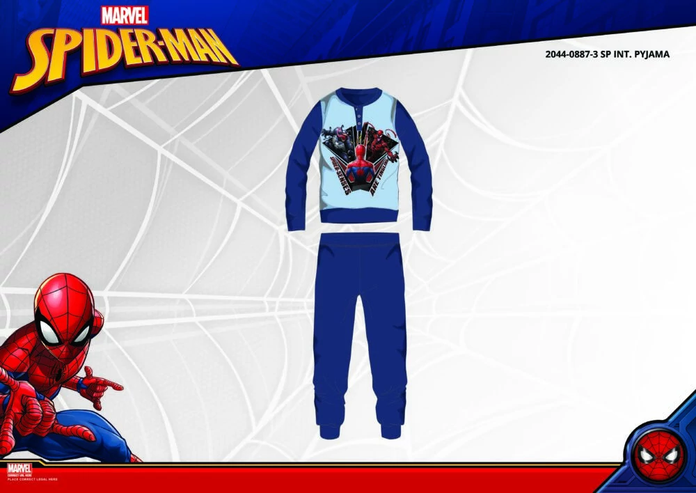 Pókember téli interlock pizsama kisfiúknak 100% pamut alapanyagból. Kényelmes bőrbarát viselet. Gombos nyakkialakítással, gumírozott derékrésszel, egyenes, szűkített szárral, Pókember mintával. Díszdobozban szállítjuk.