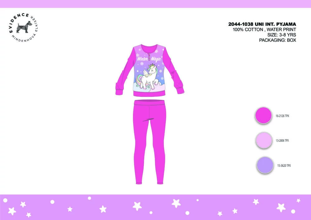Unokornis téli interlock pizsama kislányoknak 100% pamut alapanyagból. Kényelmes bőrbarát viselet. Gombos nyakkialakítással, gumírozott derékrésszel, egyenes, szűkített szárral, Unikornis mintával. Díszdobozban szállítjuk.