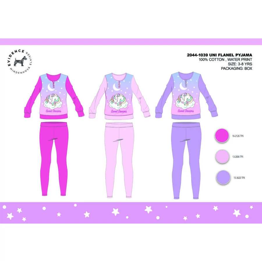 Unikornis gyerek flanel pizsama 100% pamut alapanyagból. Kényelmes, bőrbarát viselet. Belül pihe-puha bolyhos felületű. Díszdobozban szállítjuk.