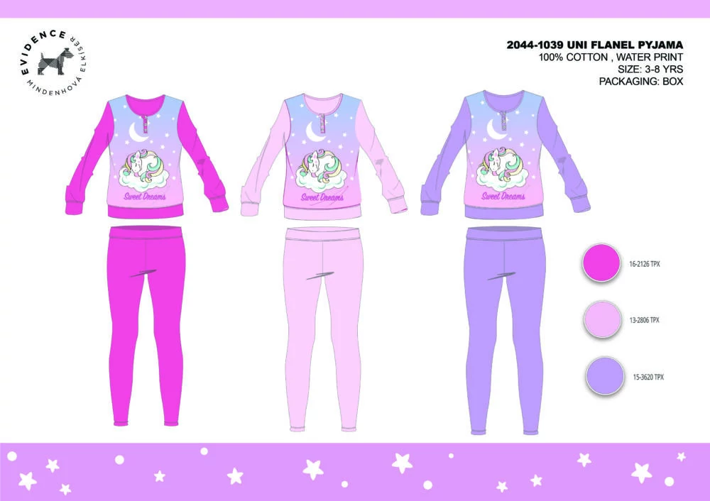 Unikornis gyerek flanel pizsama 100% pamut alapanyagból. Kényelmes, bőrbarát viselet. Belül pihe-puha bolyhos felületű. Díszdobozban szállítjuk.