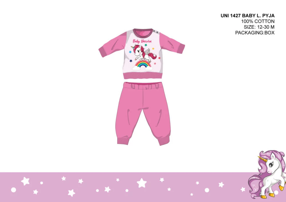 Unikornis jersey baba pizsama 100% pamut alapanyagból. Kényelmes bőrbarát viselet. A termék díszdobozban kapható.