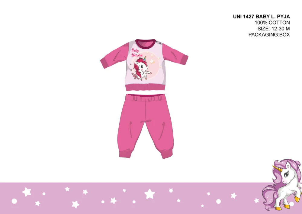 Unikornis jersey baba pizsama 100% pamut alapanyagból. Kényelmes bőrbarát viselet. A termék díszdobozban kapható.