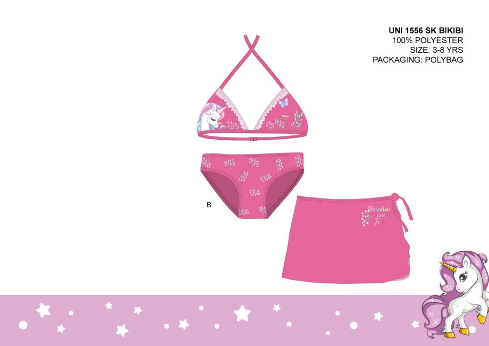 Unikornis fürdőruha szett kislányoknak - bikini háromszög felsőrésszel+szoknya - rózsaszín - 110