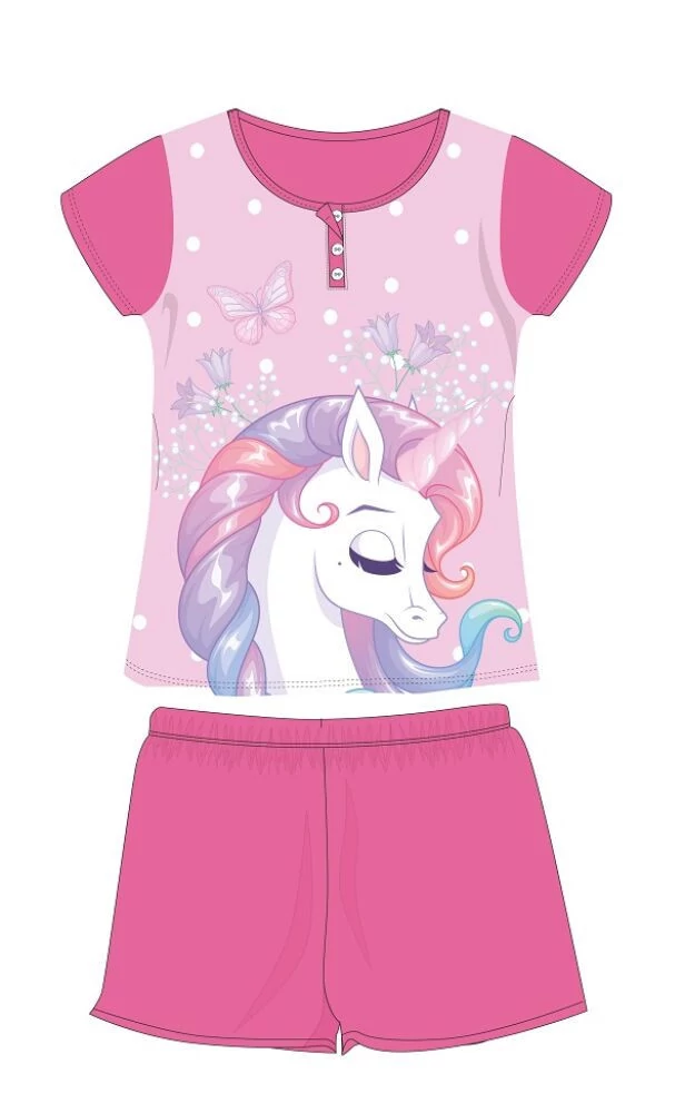 Unikornis nyári jersey pizsama kislányoknak 100% pamut alapanyagból, gombos nyakrésszel. Kényelmes, bőrbarát viselet. A termék díszdobozban kapható.