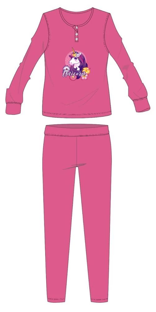 Unikornis téli interlock pizsama gyerekeknek 100% pamut alapanyagból. Kényelmes bőrbarát viselet. Gombos nyakkialakítással, gumírozott derékrésszel, egyenes, szűkített szárral, Unikornis mintával. Díszdobozban szállítjuk.