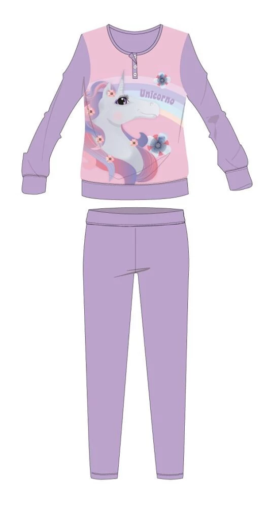 Unikornis téli interlock pizsama gyerekeknek 100% pamut alapanyagból. Kényelmes bőrbarát viselet. Gombos nyakkialakítással, gumírozott derékrésszel, egyenes, szűkített szárral, Unikornis mintával. Díszdobozban szállítjuk.