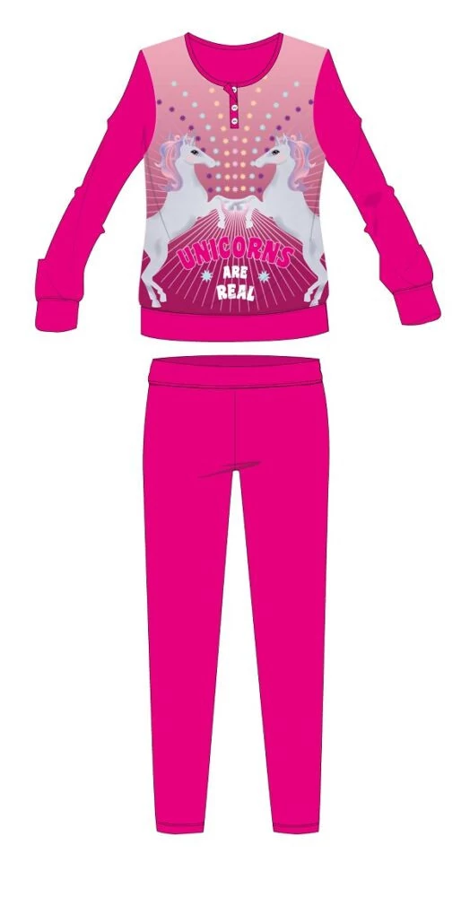 Unikornis téli interlock pizsama gyerekeknek 100% pamut alapanyagból. Kényelmes bőrbarát viselet. Gombos nyakkialakítással, gumírozott derékrésszel, egyenes, szűkített szárral, Unikornis mintával. Díszdobozban szállítjuk.